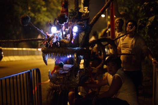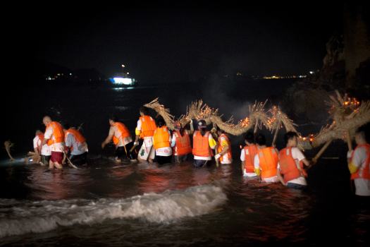 The atmosphere is solemn down on the rocky beach. Drums beat while the waterfall whispers in the background. Waves lap on the shore and candlelight illuminates the dragon’s head, which has been placed on the sand. The procession, now in bright orange life vests, stands at attention as incense is replaced. ‘Time to go! The tide is coming in! Time to get in the water!’ someone yells from the back. A heavy set man lifts the head from a squatting position and is helped to his feet as he stumbles under the weight. There is a brief flurry of excitement as the dragon’s head catches fire. Straw smoulders as a loud cry is raised from the gathered crowd. The dragon is hoisted high in the air; drums and cymbals intensify as it parades one final time. ‘Get out of the way! Out of the way!’ Alun Siu yells, clearing a path to the sea as the entire beast races towards the water. As he enters the surf, the head bearer stumbles to his knees but is quickly hauled up by the armpits. The dragon continues marching slowly into the deep, its flashing eyes shine bright as ever, their beams pierce the water even as they submerge beneath the murk. One by one, the sea extinguishes every glowing ember. The drums grow quiet as the dragon strides into the waves, then finally rise up in a crescendo. The gathered crowd rejoices with one great yawp and the bearers raise their arms in victory. A water fight ensues. All seems calm as we make our way past the roaring waterfall and back up from the beach. Good fortune, health and luck are assured for the village. Under the crisp light of the full moon, the summer heat lifts momentarily and I feel the kiss of autumn’s first breeze.
