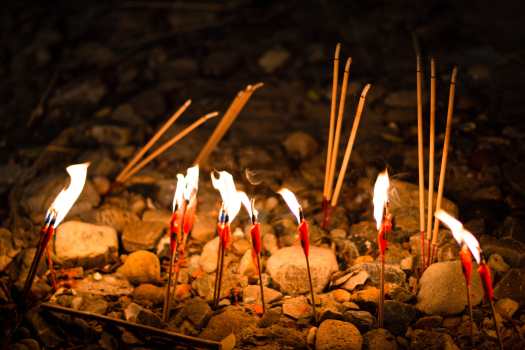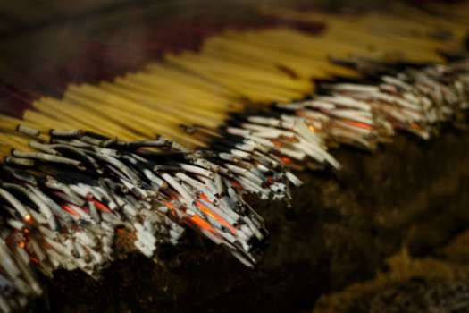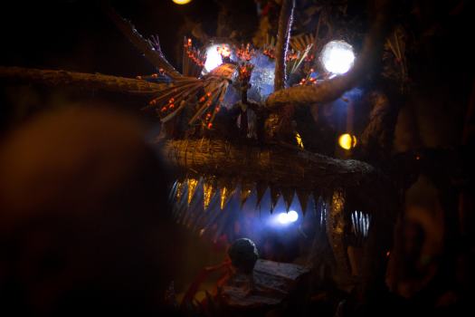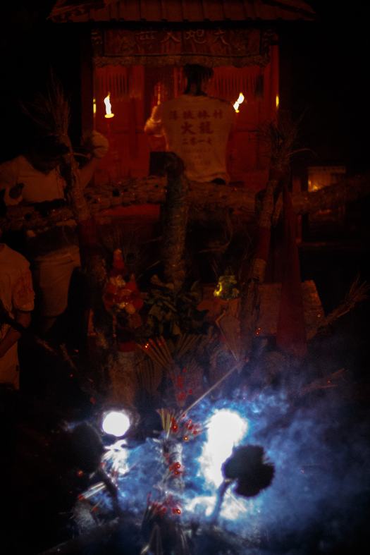 Illuminated by candles, the temple is an isle of silence. Offerings of incense are made at the altar and the dragon seems to be in repose. Smoke rises through its white-hot gaze giving it the look of its fire-breathing European cousins. In the dark, it is as though this construct of straw and bamboo has taken on the spirit of a real dragon.