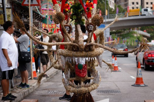 Night descends on Pokfulam as we make our way past an immense mural of the fire dragon. We emerge to the sound of drums – the lighting of the dragon’s eyes has begun. The crowd has grown as dense as the acrid smoke that now climbs the air. The dragon’s sinuous straw body has been brought up to the road and attached to its head with thick rope. Ten-inch incense sticks have been poked into the creature’s straw flanks. Resembling a winding pin cushion, the dragon is being brought to fiery life by visitors and villagers who pluck incense sticks from flaming piles on the curb.