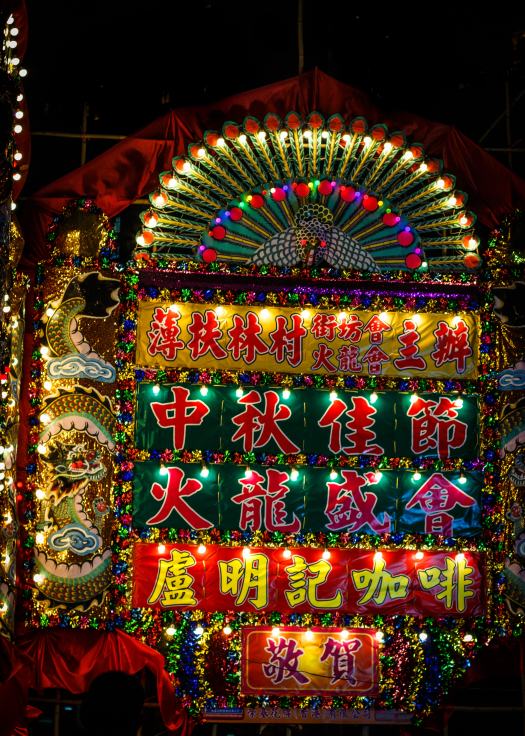 On the eve of the Mid-Autumn Festival the skies over Hong Kong are awash with dragons, bringing rain and heralding the changing of seasons. I approach Pokfulam under glowering storm clouds. The village gates have been transformed by two enormous fa pai (花牌) that glint against the iron grey in bright crimson and emerald green. Colourful pennants flap wildly in the breeze giving both a festive and martial air. ‘I’ve no time to entertain you!’ yells Alun Siu, who is in charge of this year’s Pokfulam Fire Dragon. ‘If you want to film, then film! I can’t help you right now!’ Distributing t-shirts and yelling directions to his many subordinates, Siu certainly has his hands full. The early evening air is already laced with incense; coiling tendrils of smoke tumble softly over whole roasted suckling pigs, laid out on a folding table amongst other offerings. Police have cordoned off a lane on Pokfulam Road, where the fire dragon’s head lies in wait.