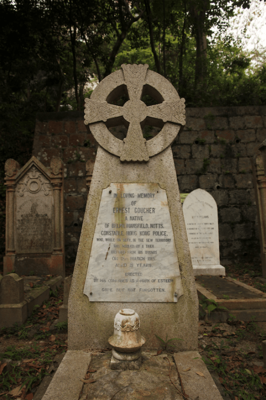 Halfway up a hill in Section 2, on the far East side of the cemetery, we find a score of policemen’s graves. Treading carefully around the plots, we count until we get to the 6th stone in the 2nd row — the grave of Police Constable Ernest Goucher, a Celtic Cross ‘erected by his comrades as a mark of esteem’. While investigating the death of a villager in Sheung Shui, P.C. Goucher had been attacked and ‘mauled by a tiger’. He had died of his wounds several days later on March 12, 1915.