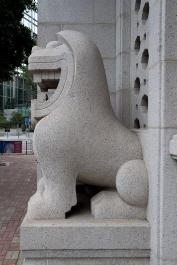 An Art Deco lion grins from its guardpost at the Bank of China Building, Hong Kong. Photo by Billy Potts.