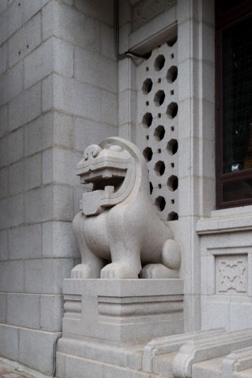 These curious lions playfully combine Chinese motifs and tradition with flowing modern curves, complementing the granite edifice which they protect. Turning the corner, however, we find the bank’s front entrance guarded not by another cheeky Art Deco duo, but by a pair of lions sculpted in the ubiquitous traditional Chinese style. Their snarls expose sharp canine fangs and their chests puff out giving them the air of pumped-up leonine bouncers. As dictated by tradition, the male lion on the right rests his paw on a ball while the lioness on the left wrangles a cub under hers. The male and female lions symbolise yin and yang like the scores of stone guardian lions that have been in China since their introduction from Persia during the Han Dynasty (206 BC-220 AD).