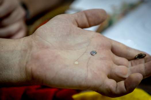 In the workshop, Jack produces an object wrapped in plastic: a scale taken from the Bendigo’s original dragon, Loong. Made from faded but fine patterned silk mounted on papier mache, the scale is ornate and studded with tiny brass fixtures inset with even tinier mirrors.